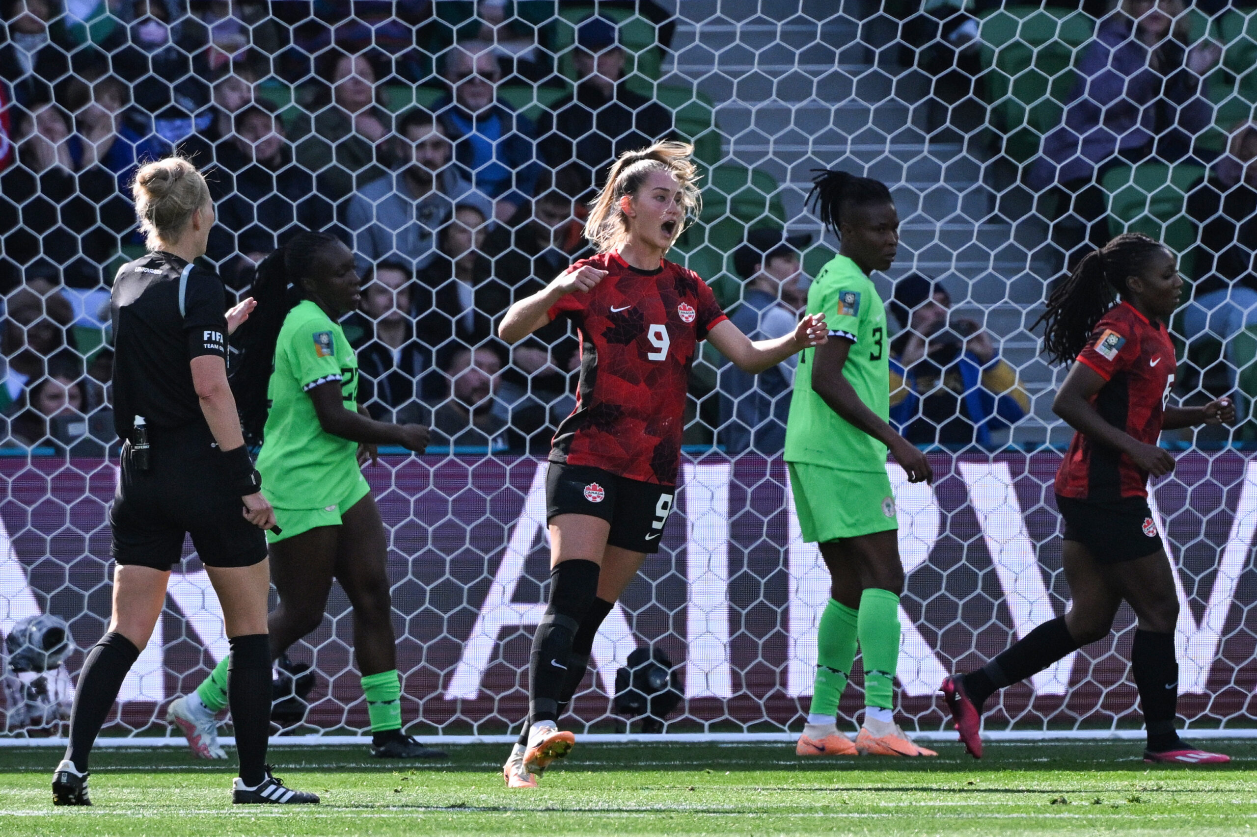 Canada’s Jordyn Huitema reacts to a missed chance on goal against Nigeria during their 2023 Women’s World Cup group match on July 21, 2023 in Melbourne, Australia [William West/AFP] -