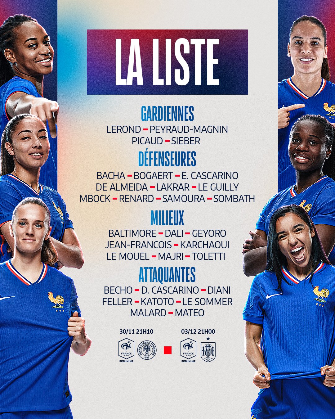 The squad boasts experienced names like Juventus defender Estelle Cascarino, Real Madrid’s Maëlle Lakrar and Sandie Toletti, and Chelsea duo Sandy Baltimore and Oriane Jean-François.