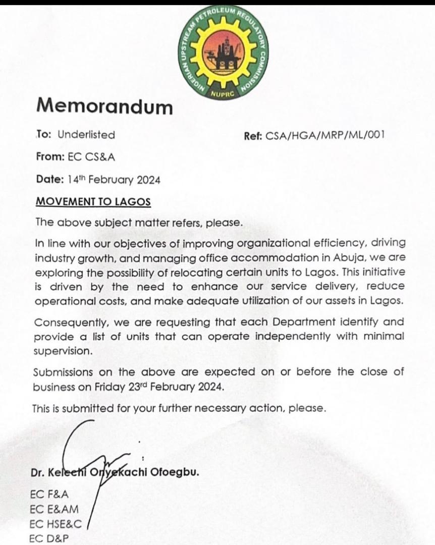 The regulatory commission said it only decided to relocate the operations of some of its technical departments to Lagos to bring its activities closer to oil bearing communities to drive its objective of improving organizational efficiency.