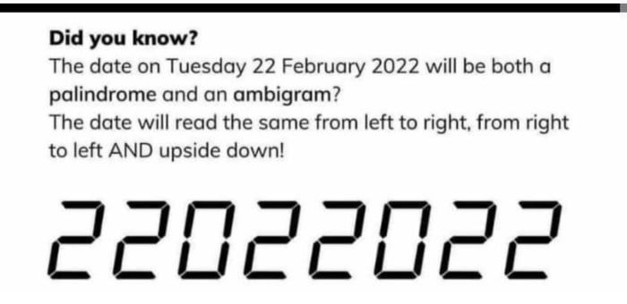 If we drop the slash marks from today’s date, you will notice that it contains only two digits — 0 and 2. The palindrome and ambigram work for the British date format (dd-mm-yyyy) but not for the US date format (mm-dd-yyyy) for the 22nd of February 2022.