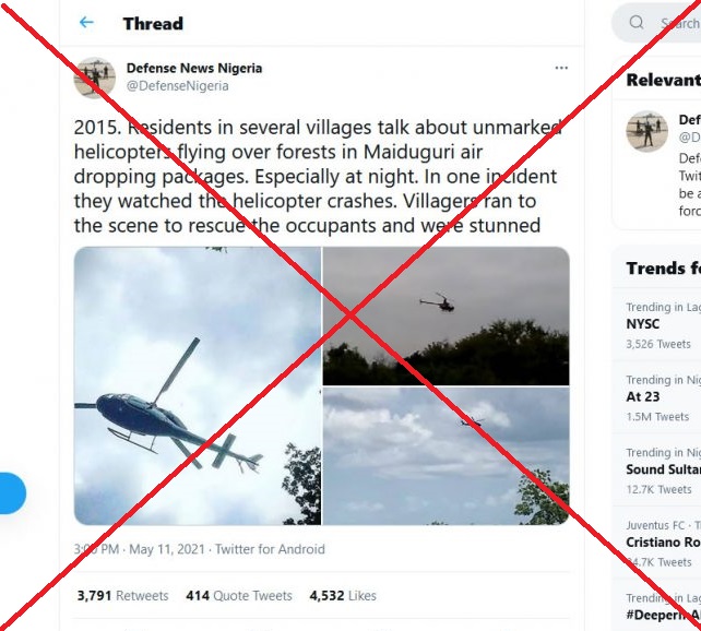 A Twitter post shared thousands of times has claimed that three photos of unmarked helicopters were taken while “flying over forest in Maiduguri airdropping packages.”