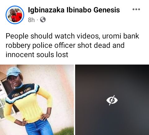 He wrote; “The female police woman who lost her life to the robbery attack in Uromi yesterday. She’s the only female child of her parents, and my neighbour. May her soul rest in peace.”