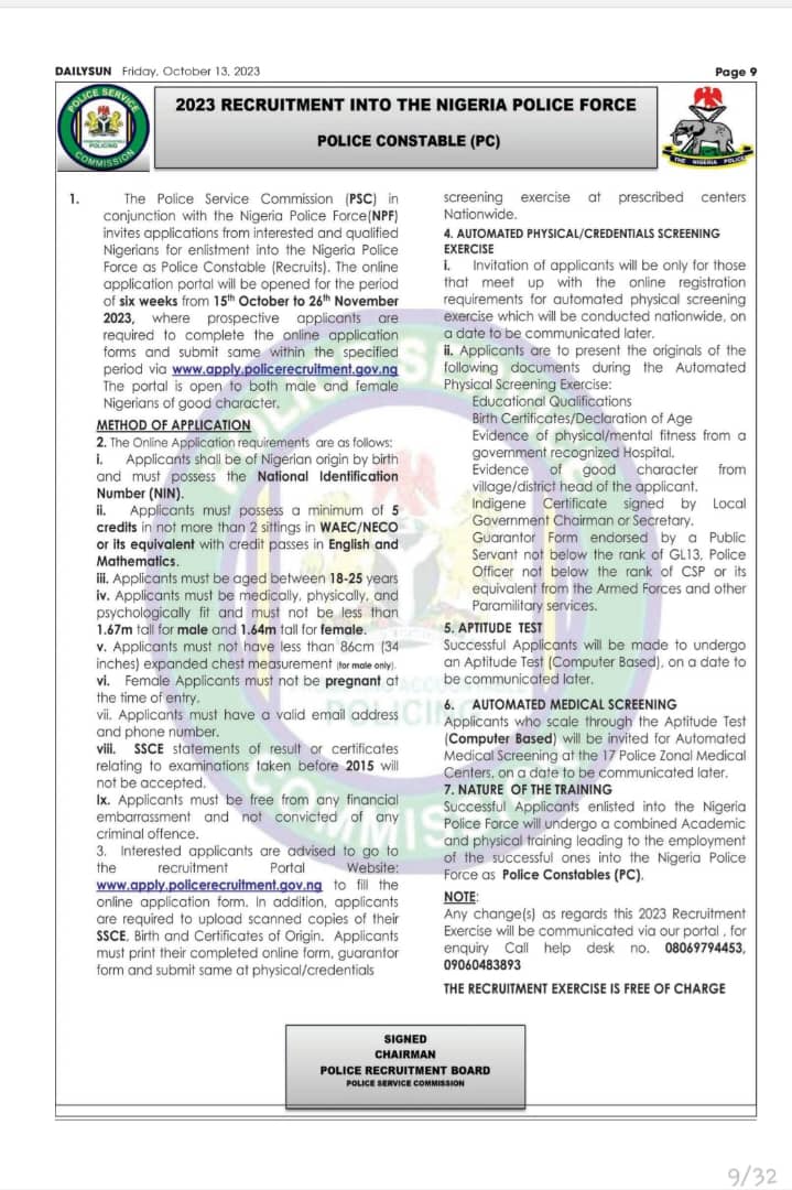 The Inspector-General of Police hereby issues a strong charge to all applicants, urging them to exercise vigilance and caution throughout the application process. He warned against the activities of fraudsters and individuals who may attempt to exploit the recruitment process for personal gain. The IGP assures that the Police Recruitment Board comprises dedicated and disciplined individuals who will ensure a transparent and meri-based recruitment process devoid of corrupt and other sharp practices. He emphasized that the application and selection process is FREE, and will be carried out through official channels and that unscrupulous activities should be promptly reported to the authorities for necessary action.