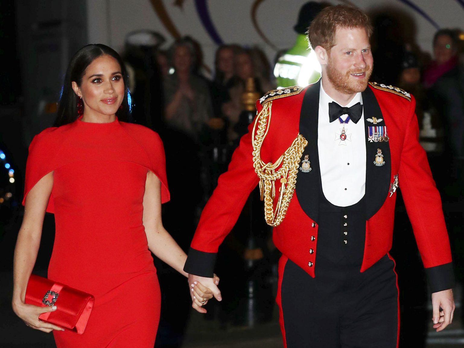 Meghan Markle wearing red outfit, Prince Harry wearing a military uniform