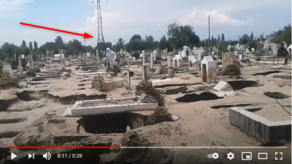 The video’s caption puts the location of the ruined cemetery in Konibodom (also Kanibadam), a city in the central Asian country of Tajikistan. A translation of the article’s headline reads: “Disaster raged in Tajikistan: one person died, hundreds of houses and a cemetery were damaged.”