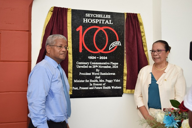 The Seychelles Hospital celebrates its centennial anniversary and to commemorate the event a commemorative plaque was unveiled by President Wavel Ramkalawan and the Health Minister, Peggy Vidot, on Thursday.