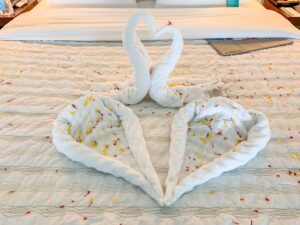 The bed had a beautiful arrangement of towel swans and flower petals. I’m not sure if this was because I told the hotel we were celebrating our sixth anniversary (there was no card or cake or anything to suggest that), but they remade the swans a few times and even made a heart out of flowers on the bed once, which was a nice touch.