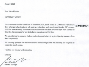 You can’t control the weather and it’s not the hotel’s fault, but I was surprised that no one explained that we could still walk down to the beach by going out on the main road and following a public path. My girlfriend ended up asking on our second day and was given clear directions, but with property damage like this, I think providing a map with an alternate route is the bare minimum you can do for your guests.