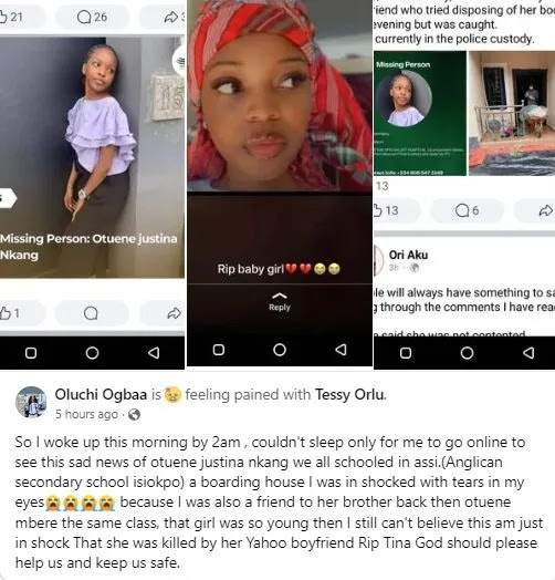 ‘’So I woke up this morning by 2am , couldn’t sleep only for me to go online to see this sad news of otuene justina nkang we all schooled in assi.(Anglican secondary school isiokpo) a boarding house I was in shocked with tears in my eyes because I was also a friend to her brother back then otuene mbere the same class, that girl was so young then I still can’t believe this am just in shock That she was killed by her Yahoo boyfriend Rip Tina God should please help us and keep us safe.”