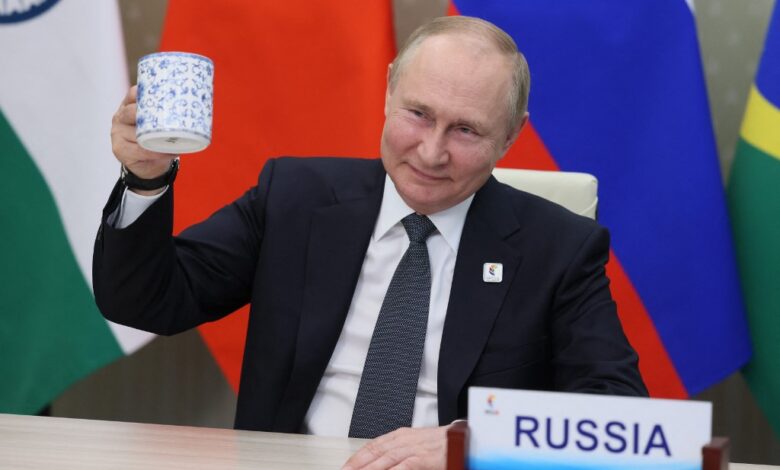 Russian President Vladimir Putin makes a toast as he takes part in the XIV BRICS summit in virtual format via a video call, in Moscow on June 23, 2022. Mikhail Metzel / SPUTNIK / AFP