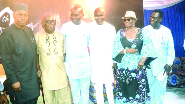 Managing Director/Editor in Chief, The Guardian newspaper, Martins Oloja (left); Broadcaster, Benson Idonije; celebrant, Jahman Anikulapo; Professor Duro Oni; Actress, journalist, television presenter, Taiwo Ajai-Lycett and Dramatist, Ben Tomoloju at the 60th birthday culture colloquium at the freedom park in Lagos… yesterday.<br />PHOTO: SUNDAY AKINLOLU