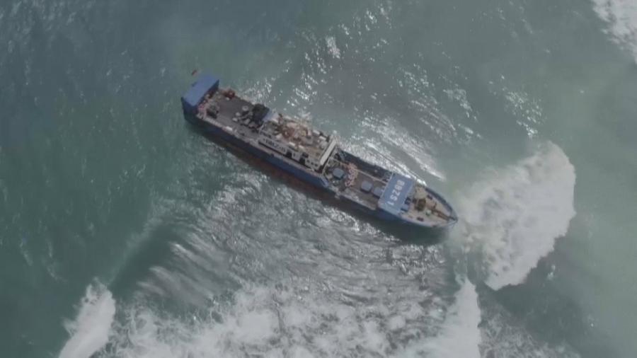 The grounded ship has spilled a small amount of fuel into the ocean, but its hull remains intact, according to the local newspaper, L’Express.