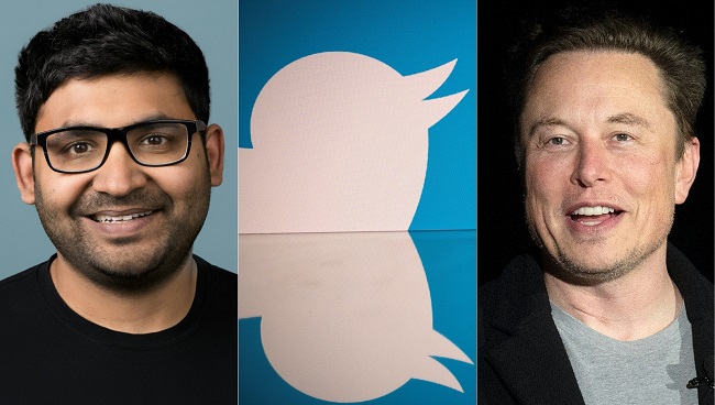 (COMBO) This combination of pictures created on October 27, 2022 shows (From L) this undated and unlocated handout photo released on November 29, 2021 courtesy of Twitter shows new Twitter CEO Parag Agrawal , this photograph taken on October 26, 2020 shows the logo of US social network Twitter displayed on the screen of a smartphone and a tablet in Toulouse, southern France, and Elon Musk (Photos by various sources / AFP)