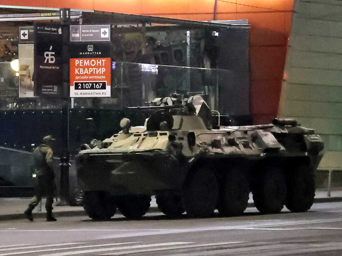 An armored personnel carrier is parked in a street in the city of Rostov-on-Don early Saturday.