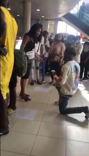 In the trending video, the lady’s boyfriend is seen on his knee with an engagement ring in his hand. The lady was seen telling her man that she won’t accept his engagement ring. Some people in background were heard telling the lady to accept the proposal.