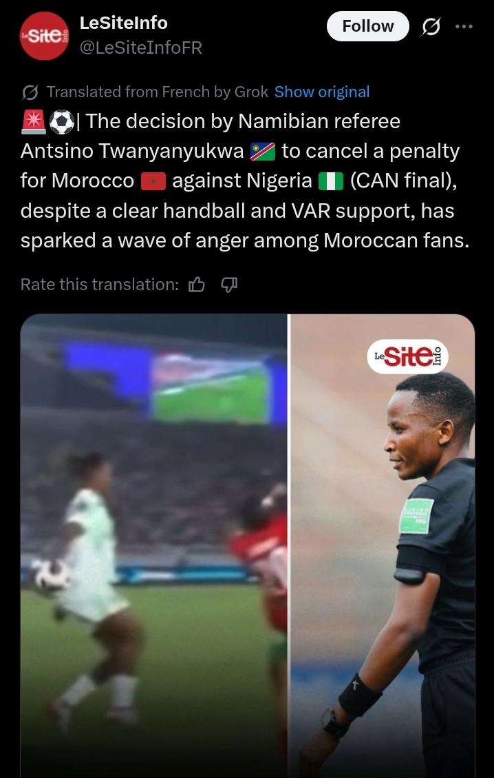Twanyanyukwa initially awarded Morocco a penalty, only to reverse her decision after a lengthy VAR review. The replays confirmed Demehin’s hand was in a natural position and close to her body, prompting VAR to advise the referee to overturn the call.