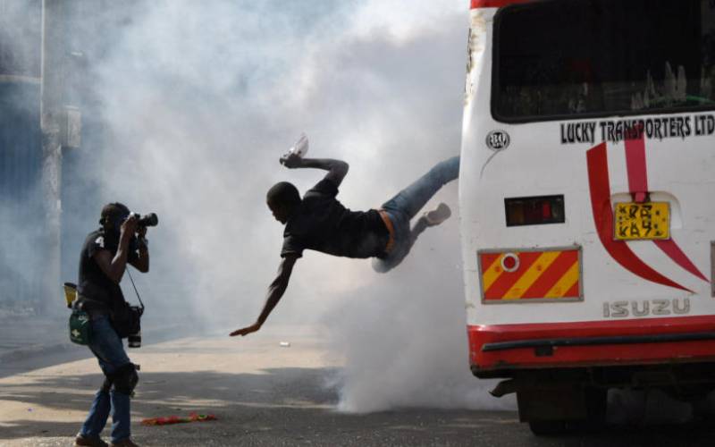 A man jumps from a bus after police fired teargas canisters to disperse protestors after Raila Odinga’s swearing-in ceremony in Nairobi, January 30, 2018. [Reuters]