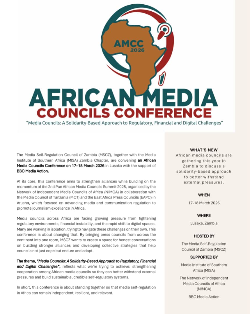 The Media Self-Regulation Council of Zambia is hosting the African Media Councils Conference on March 17-18, 2026, at the Urban Hotel in Lusaka. The event brings together media councils from across Africa to discuss regulatory, financial, and digital challenges facing the industry. The conference theme is “Media Councils: A Solidarity-Based Approach to Regulatory, Financial and Digital Challenges.